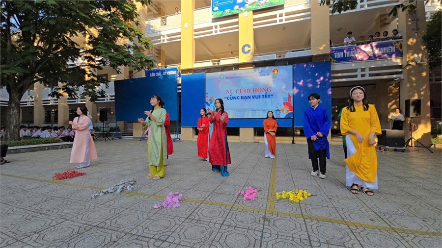 Đặc biệt, chương trình còn mang đến tiết mục biểu diễn áo dài truyền thống và múa xuân đầy màu sắc. Những tà áo dài duyên dáng với nhiều gam màu tươi sáng như đỏ, vàng, xanh… đã góp phần tôn vinh vẻ đẹp văn hóa Việt Nam. Các bạn học sinh thể hiện những bước múa nhẹ nhàng, uyển chuyển trong giai điệu mùa xuân, tạo nên một bức tranh Tết rực rỡ và đầy sức sống.